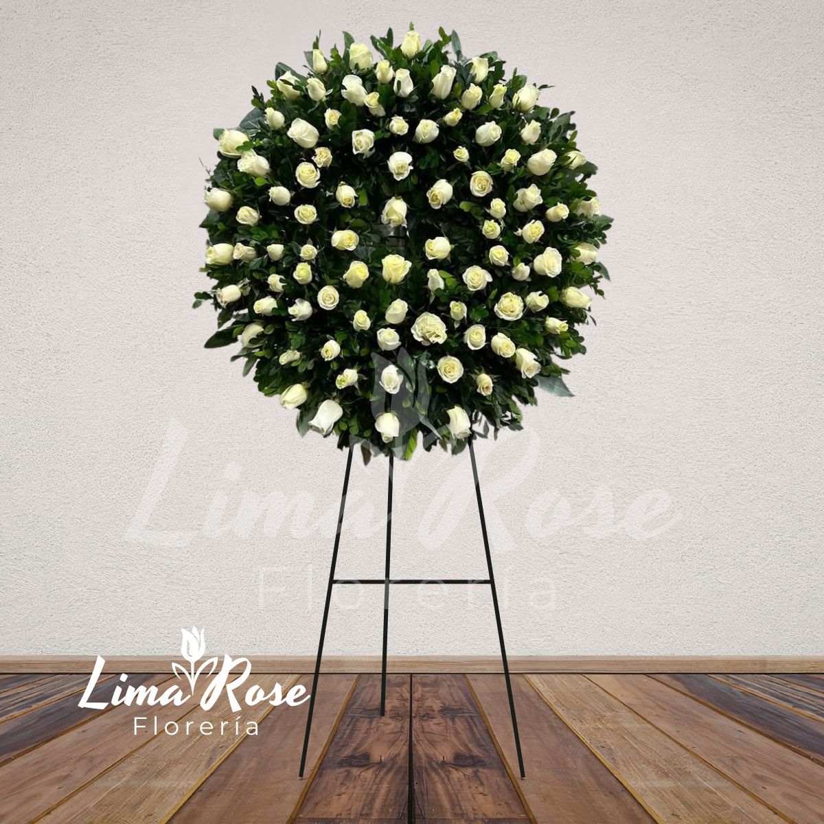 Imponente corona fúnebre redonda de categoría premium, compuesta por abundantes rosas cuidadosamente seleccionadas y complementada con fino follaje verde natural que realza su volumen y armonía. Su diseño circular, símbolo de eternidad y recuerdo permanente, destaca por su elegancia, presencia y alto nivel de detalle floral. Ideal para rendir un homenaje solemne y distinguido, transmitiendo amor, respeto y acompañamiento profundo en momentos de despedida. Presentada sobre parante con una altura aproximada de 2.20 metros, ofreciendo una presencia impactante y majestuosa en la ceremonia. Incluye tarjeta impresa para dedicatoria personalizada.