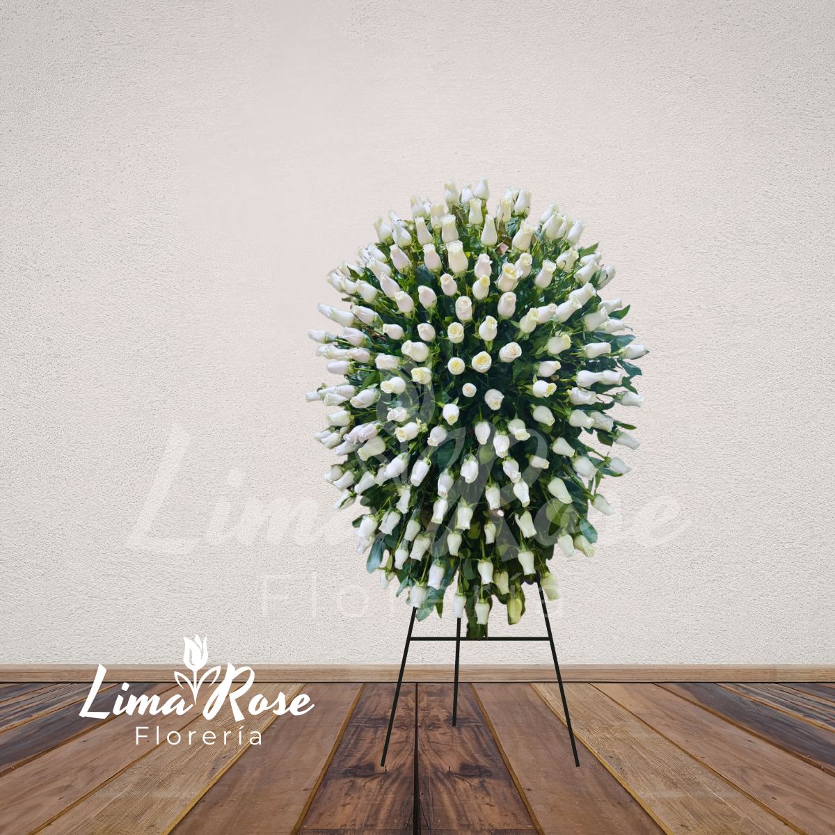 Elegante trípode fúnebre mediano con arreglo floral tipo lágrima, elaborado con una gran cantidad de rosas blancas cuidadosamente seleccionadas y fino follaje verde natural que realza su volumen y armonía. A pesar de su altura aproximada de 1 metro, este diseño destaca por su abundante composición floral, incorporando más rosas que algunos modelos de coronas de mayor tamaño, ofreciendo así una presencia visual impactante y distinguida. Su forma en lágrima simboliza amor eterno, respeto y un homenaje sincero en momentos de despedida. Incluye tarjeta impresa para dedicatoria personalizada.