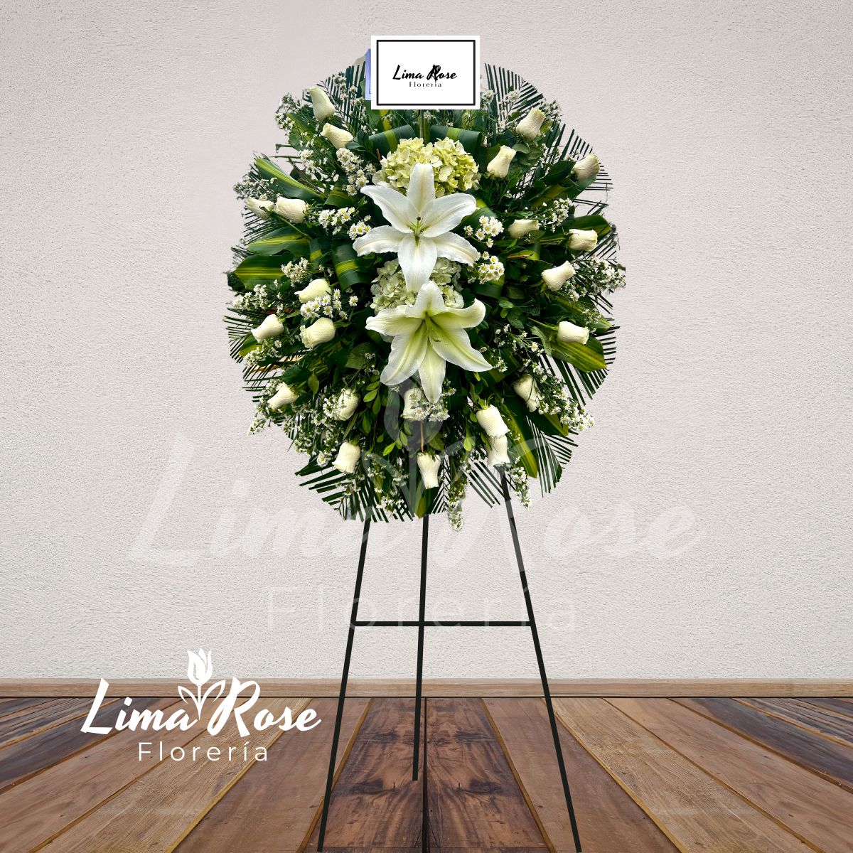 Corona fúnebre clásica en tonalidad blanca, elaborada con rosas blancas seleccionadas y complementada con doble lilium que aporta distinción y realce al diseño. El fino follaje verde natural enmarca la composición, brindando equilibrio, frescura y sobriedad. Este modelo representa paz, pureza y respeto, siendo una opción tradicional y significativa para expresar condolencias con elegancia. Presentada sobre parante con una altura aproximada de 2 metros. Incluye tarjeta impresa para dedicatoria personalizada.