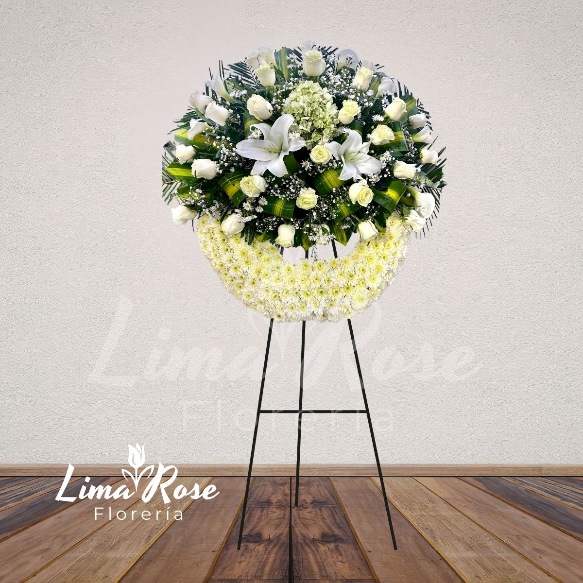 Corona fúnebre elaborada con rosas blancas seleccionadas, destacando un diseño floral concentrado en la parte superior, donde se integra un delicado complemento de flores blancas y doble lilium que aportan realce, elegancia y mayor volumen visual. El fino follaje verde natural enmarca la composición, brindando equilibrio y sobriedad al conjunto. Este modelo simboliza paz, respeto y pureza, siendo una opción distinguida para rendir homenaje con elegancia en ceremonias de despedida. Presentada sobre parante con una altura aproximada de 2 metros. Incluye tarjeta impresa para dedicatoria personalizada.