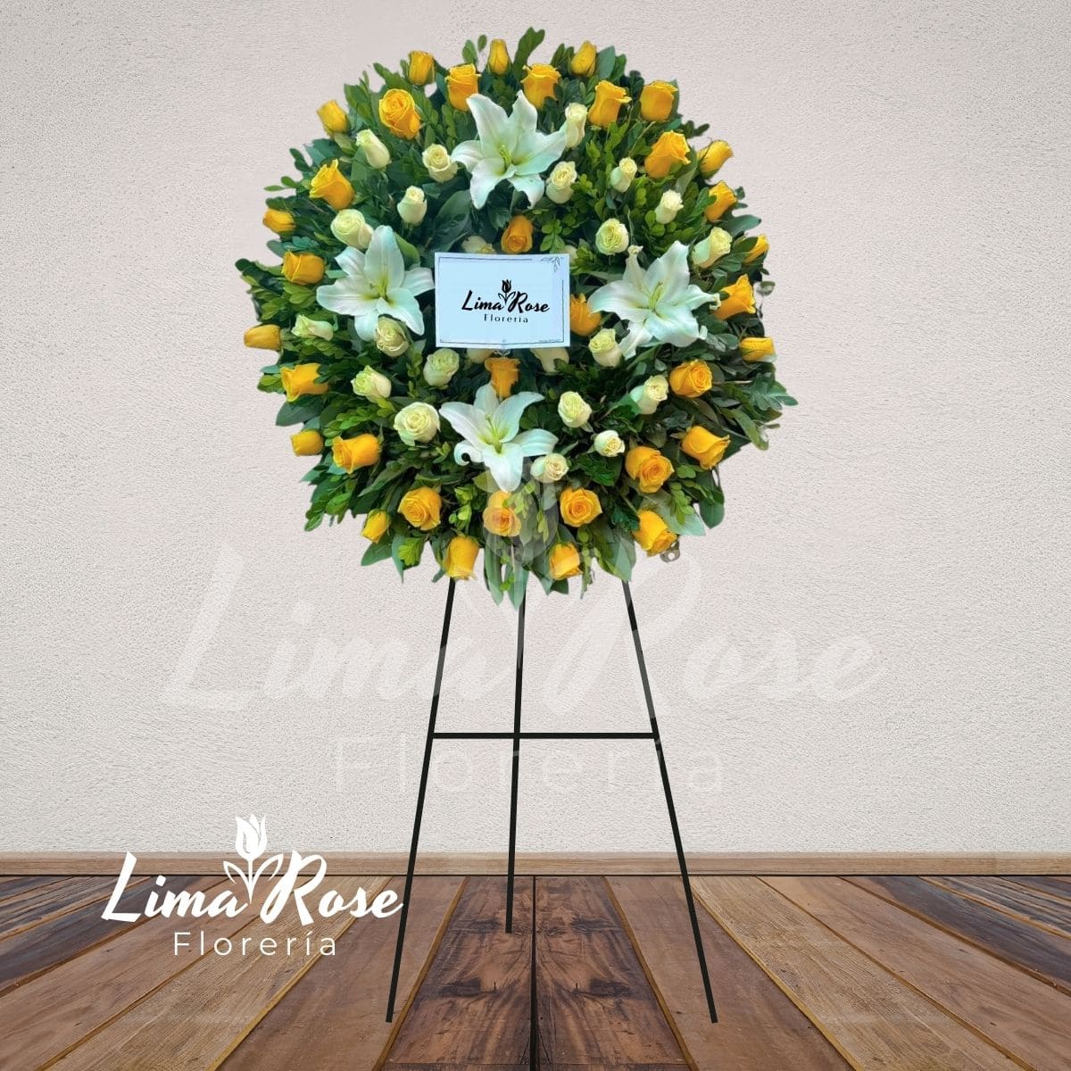 Majestuosa corona floral en forma de dona, elaborada con una armoniosa combinación de rosas amarillas y blancas, acompañadas de delicados liliums y fino follaje verde que aportan frescura y equilibrio al diseño. Las rosas amarillas simbolizan luz y gratitud, mientras que las blancas representan paz y pureza, creando un homenaje lleno de respeto y significado. Su estructura circular refleja eternidad y recuerdo infinito. Ideal para expresar condolencias con elegancia y distinción. Altura aproximada: 2 metros Flores principales: Rosas amarillas y blancas, liliums frescos Follaje: Verde fino decorativo Estilo: Solemne y elegante Incluye: Tarjeta con dedicatoria personalizada Las tonalidades pueden variar ligeramente según disponibilidad, manteniendo siempre la armonía del diseño.