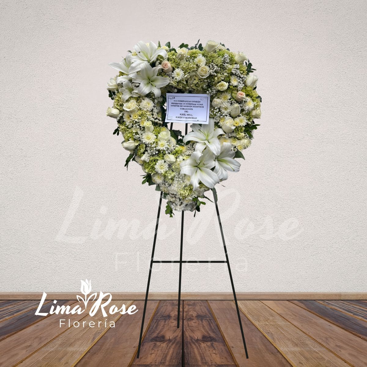 Corona floral en forma de corazón, elaborada sobre una base completa de flores blancas que realzan su silueta con pureza y armonía. Está compuesta por rosas blancas y delicadas flores complementarias en tonos blancos, creando una composición sobria y refinada. En la parte superior e inferior destacan liliums blancos que aportan mayor presencia y distinción, acompañados de un toque de fino follaje verde que equilibra el diseño. Ideal para expresar paz, respeto y un homenaje lleno de elegancia. Altura aproximada: 2 metros Flores principales: Rosas blancas y liliums Complementos: Flores blancas y follaje verde fino Incluye: Tarjeta con dedicatoria personalizada Las flores pueden presentar ligeras variaciones según disponibilidad, manteniendo siempre la calidad y estética del diseño.