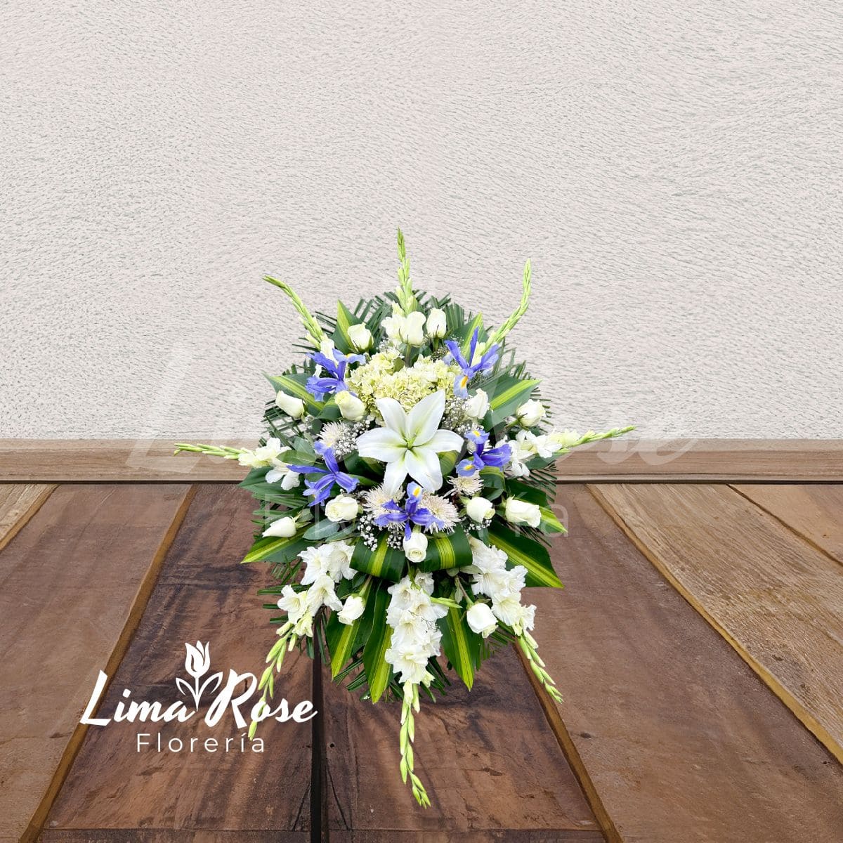 Arreglo floral tipo lágrima de piso en tamaño pequeño, con medidas aproximadas de 60 x 60 cm. Elaborado con rosas blancas y flores blancas complementarias que aportan armonía y sobriedad al diseño. En el centro destaca un lilium blanco como punto focal, mientras que gladiolos en los bordes brindan estructura y presencia. Se complementa con flor de iris que añade un toque elegante y distintivo. Ideal para expresar respeto y acompañamiento en homenajes íntimos. Medidas aproximadas: 60 x 60 cm Flores principales: Rosas blancas, lilium central, gladiolos y flor de iris Incluye: Tarjeta con dedicatoria personalizada Las flores pueden variar ligeramente según disponibilidad, manteniendo siempre la calidad y estética del diseño.