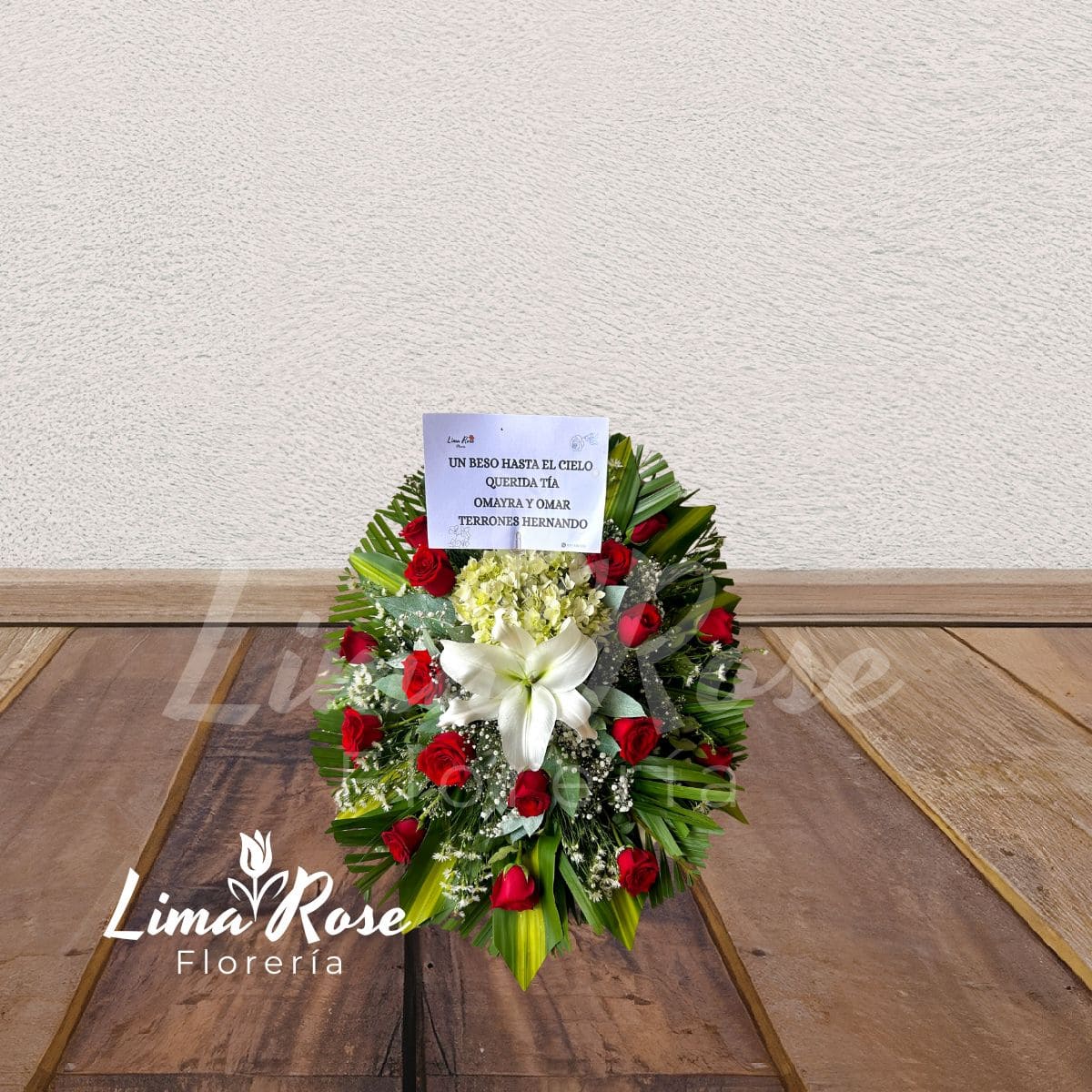 Lágrima de piso con medidas aproximadas de 60 x 60 cm, elaborada con rosas rojas de primera selección que aportan intensidad y elegancia al diseño. En el centro destaca un lilium como punto focal de distinción. Se complementa con delicadas flores blancas y fino follaje verde, logrando una composición armoniosa, sobria y elegante. Ideal para expresar amor profundo, respeto y homenaje. Medidas aproximadas: 60 x 60 cm Tipo: Lágrima de piso Flores principales: Rosas rojas, lilium central y flores blancas complementarias Incluye: Tarjeta con dedicatoria personalizada Las flores pueden variar ligeramente según disponibilidad, manteniendo siempre la calidad y estética del arreglo.