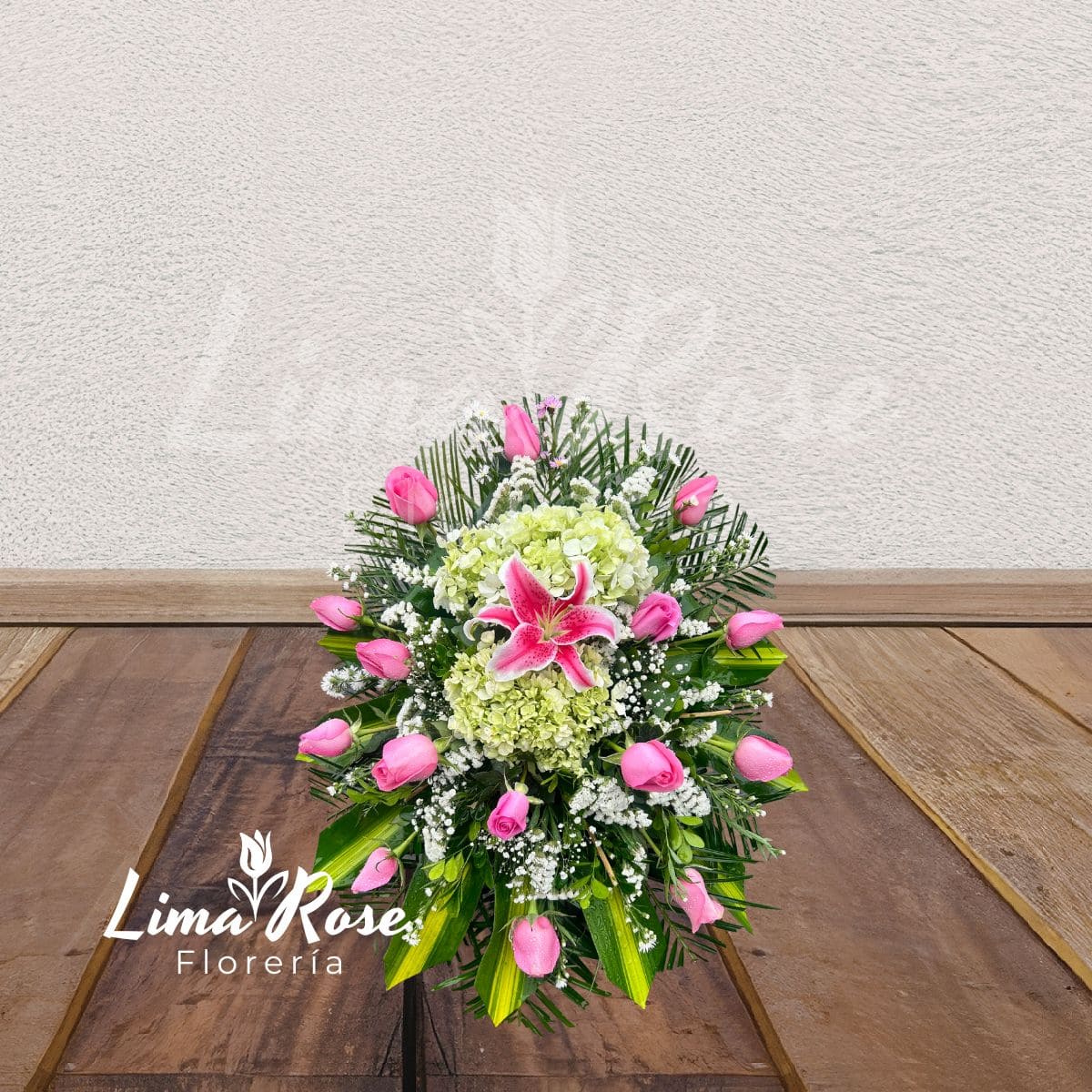 Lágrima de piso con medidas aproximadas de 60 x 60 cm, elaborada con rosas rosadas de primera selección y un lilium rosa en el centro que aporta presencia y distinción. Se complementa con flores blancas decorativas y fino follaje verde, creando una composición armoniosa y elegante. Ideal para expresar cariño, respeto y acompañamiento en homenajes o eventos especiales. Medidas aproximadas: 60 x 60 cm Tipo: Lágrima de piso Flores principales: Rosas rosadas y lilium rosa Complementos: Flores blancas y follaje verde fino Estilo: Clásico y elegante Incluye: Tarjeta con dedicatoria personalizada Las flores pueden variar ligeramente según disponibilidad, manteniendo siempre la calidad y estética del diseño.