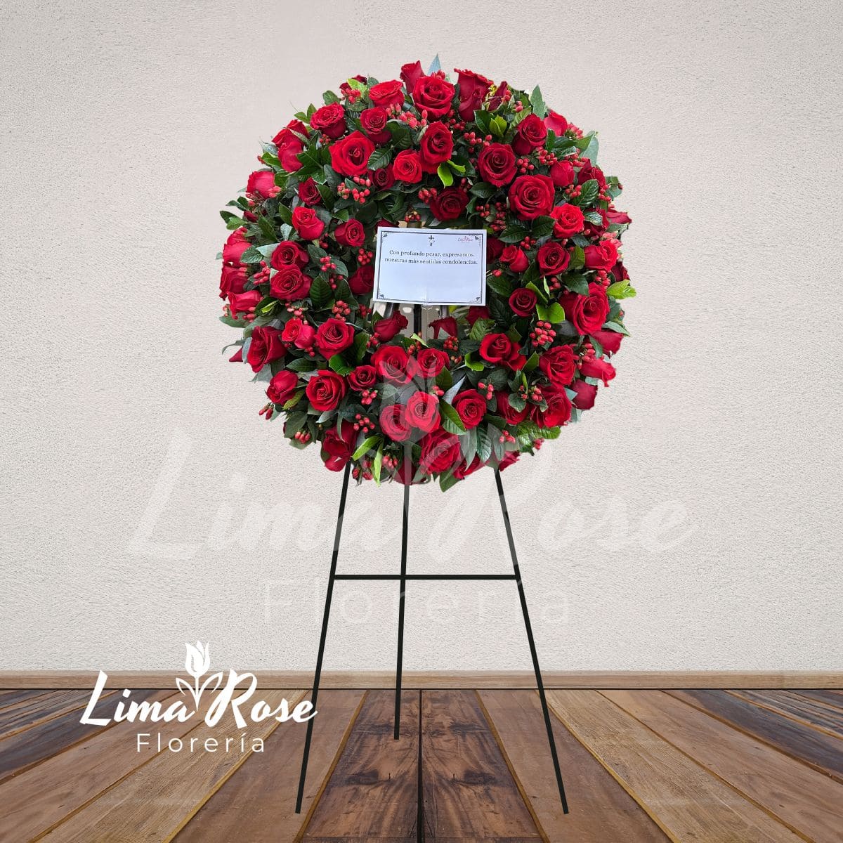 Dona Roja Premium Imponente corona floral tipo dona, elaborada con rosas rojas de primera selección que cubren completamente la base, acompañadas de flores complementarias en tonos rojos y fino follaje verde que realza la armonía y el volumen del diseño. Un arreglo de gran presencia y elegancia, ideal para expresar amor, respeto y homenaje con un toque sofisticado. Altura aproximada: 2 metros aprox. Flores principales: Rosas rojas Complementos: Flores rojas y follaje verde fino Estilo: Premium, elegante y sobrio Incluye: Tarjeta con dedicatoria personalizada Las flores pueden variar ligeramente según disponibilidad, manteniendo siempre la calidad y estética del diseño.