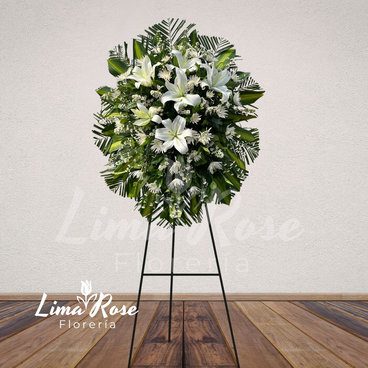 Elegante corona floral elaborada con flores blancas complementarias y fino follaje verde que aportan frescura y armonía al diseño. En el centro destacan liliums blancos, que funcionan como punto focal y realzan la sofisticación y presencia de la corona. Ideal para expresar paz, respeto y homenaje con un estilo sobrio y delicado. Altura aproximada: 2 metros aprox. Flores principales: Liliums blancos Complementos: Flores blancas y follaje verde fino Estilo: Elegante y sobrio Incluye: Tarjeta con dedicatoria personalizada Las flores pueden variar ligeramente según disponibilidad, manteniendo siempre la calidad y estética del diseño.