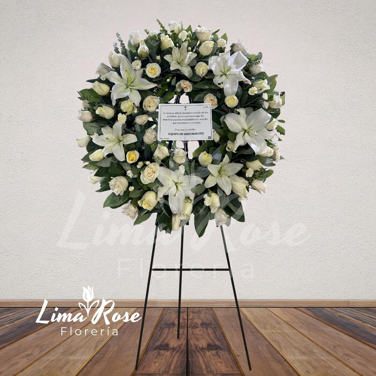 Imponente corona floral tipo dona, elaborada completamente con rosas blancas de primera selección y fino follaje verde que aporta frescura y armonía al diseño. El arreglo se complementa con liliums blancos distribuidos en toda la superficie, creando un efecto elegante y majestuoso que realza la presencia de la corona. Ideal para expresar paz, respeto y homenaje con un estilo sofisticado y sobrio. Altura aproximada: 2 metros aprox. Flores principales: Rosas blancas y liliums blancos Complementos: Follaje verde fino Estilo: Premium, elegante y solemne Incluye: Tarjeta con dedicatoria personalizada Las flores pueden variar ligeramente según disponibilidad, manteniendo siempre la armonía y calidad del diseño.