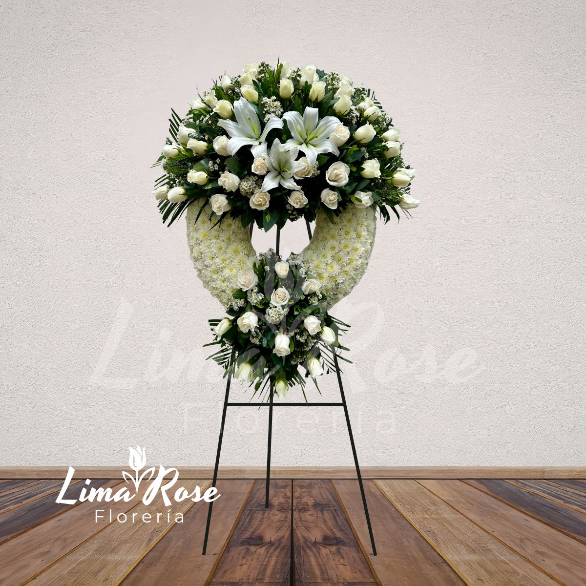 Imponente corona floral de 2 metros de altura, diseñada sobre una delicada base circular de flores blancas que simbolizan paz y pureza. En la parte superior destaca una composición principal de mayor volumen elaborada con finas rosas blancas, lilium blanco y abundante follaje verde natural, creando una presencia majestuosa y armoniosa. En la parte inferior, una composición más sutil de rosas blancas y follaje complementa el diseño, aportando equilibrio y elegancia a toda la estructura. Una pieza premium que transmite respeto, luz y homenaje eterno, ideal para despedidas solemnes y ceremonias de gran significado.