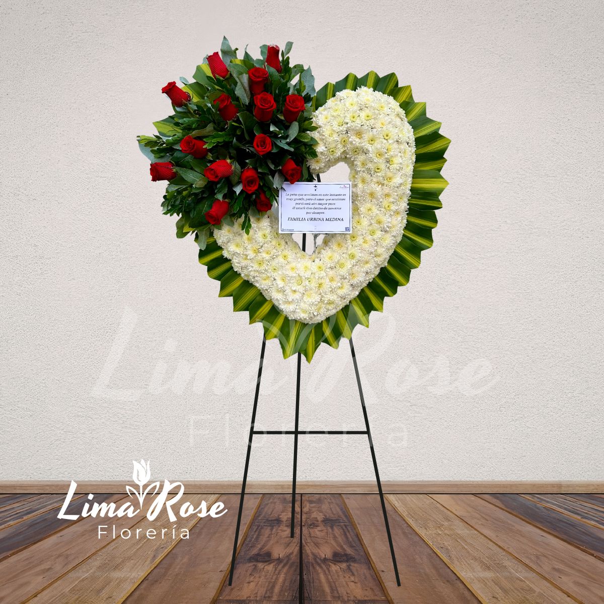 Imponente corona floral en forma de corazón, con una altura aproximada de 2 metros, elaborada con delicadas flores blancas que simbolizan paz y pureza. Su contorno está finamente definido con follaje verde natural, aportando elegancia y armonía al diseño. En la parte superior izquierda destaca una composición especial de rosas rojas acompañadas de fino follaje, creando un contraste profundo y significativo que representa amor eterno, respeto y homenaje sincero. Una pieza de gran presencia y solemnidad, ideal para expresar un último adiós lleno de amor y honor.