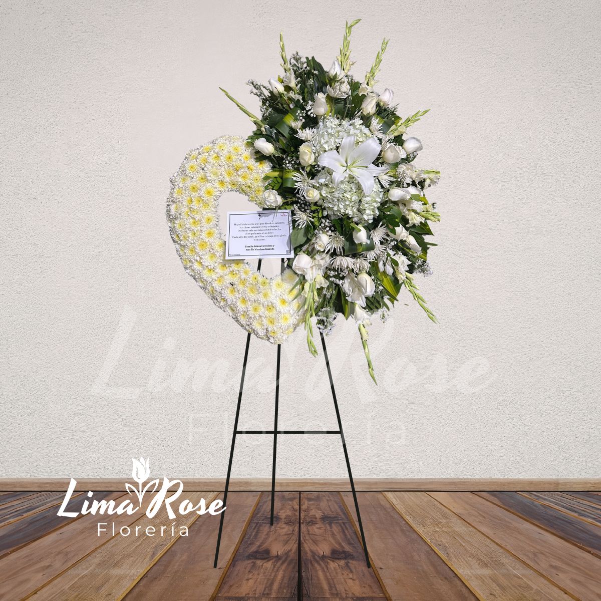 Imponente corona floral en forma de corazón, con una altura aproximada de 2 metros, elaborada íntegramente con delicadas flores blancas que simbolizan paz, luz y descanso eterno. A un lado del diseño se integra una distinguida composición floral compuesta por rosas blancas y un lilium central que aporta elegancia y protagonismo, acompañada de finas flores complementarias blancas y delicado follaje verde natural, logrando una presentación armoniosa y de gran presencia. Incluye tarjeta impresa para dedicatoria personalizada, permitiendo expresar un mensaje de despedida lleno de respeto y sentimiento. Una pieza solemne y significativa, ideal para rendir homenaje con amor eterno y serenidad.
