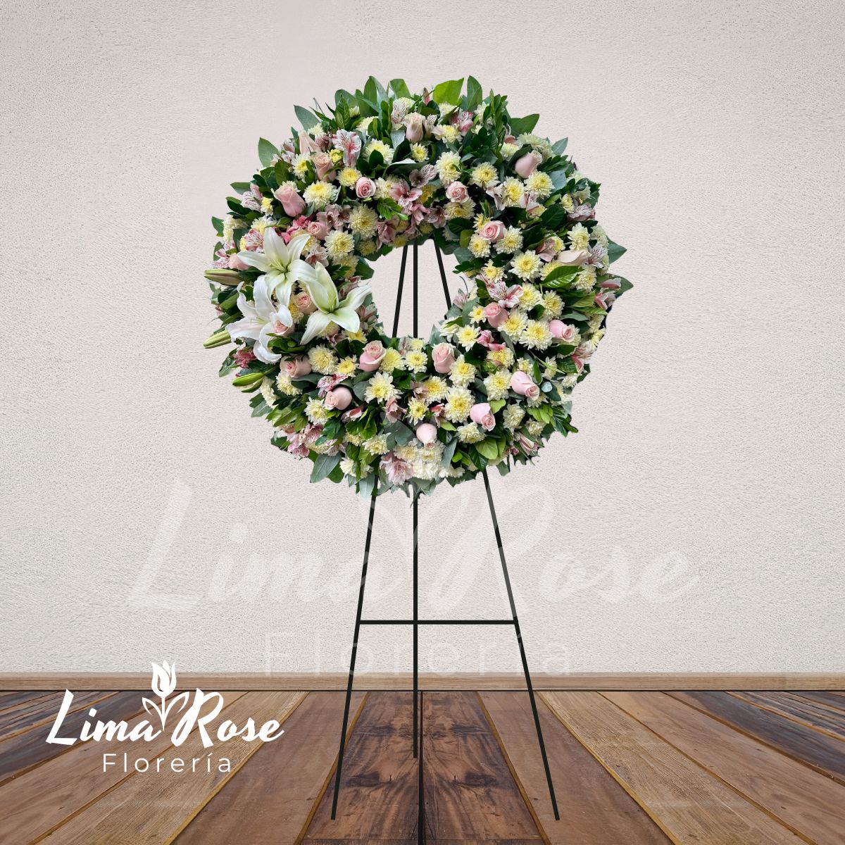 Elegante corona en forma de dona, con una altura aproximada de 2 metros, elaborada con una variada selección de flores complementarias en tonos rosa y blanco que aportan suavidad, equilibrio y un acabado distinguido. El diseño se realza con finas rosas rosadas cuidadosamente distribuidas en la superficie, creando volumen y armonía visual, complementadas con fino follaje verde natural que brinda frescura y estructura. En el lado izquierdo destacan tres elegantes liliums blancos que aportan protagonismo, pureza y un contraste sutil dentro de la composición. Incluye tarjeta impresa para dedicatoria personalizada. Una pieza delicada y refinada, ideal para rendir un homenaje lleno de cariño, serenidad y recuerdo eterno.