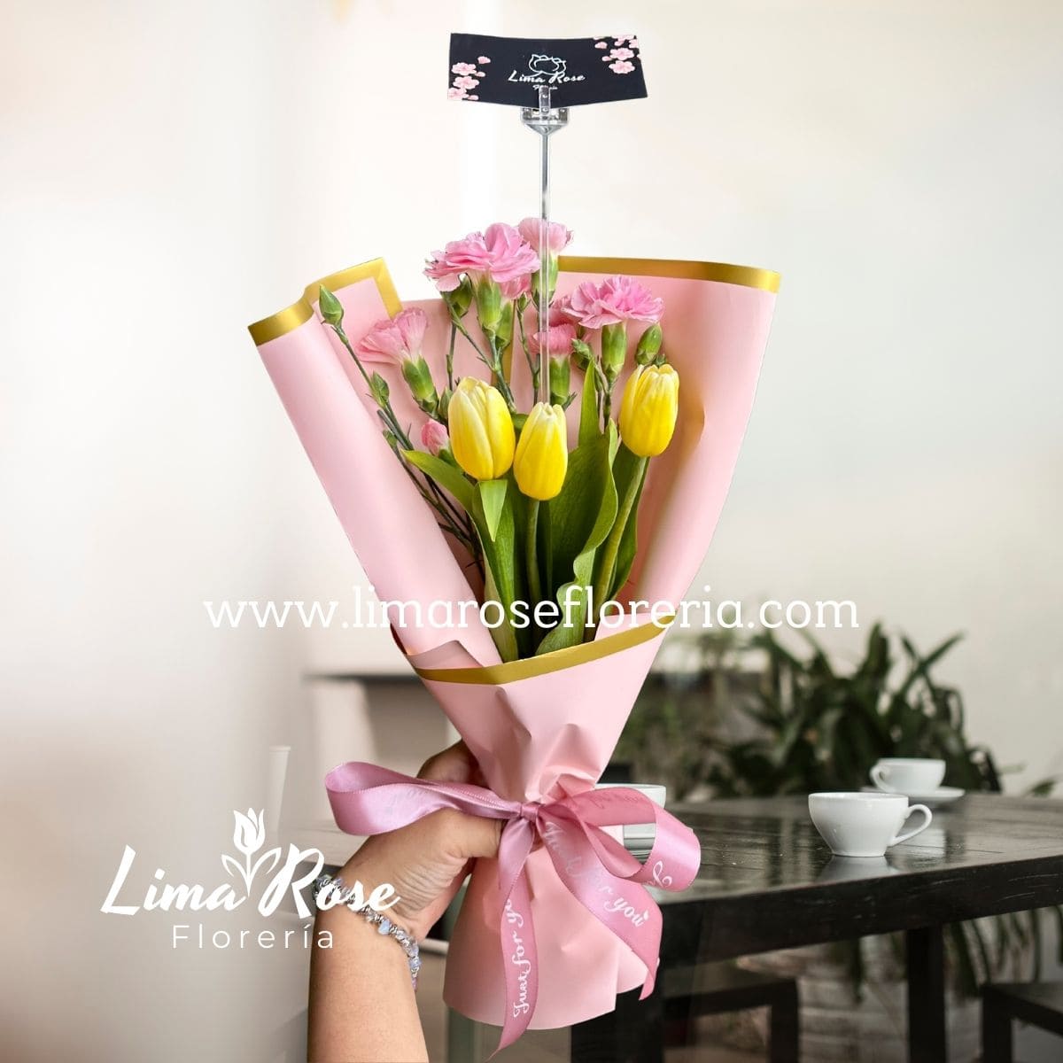 Encantador ramo compuesto por 3 tulipanes frescos acompañados de claveles seleccionados y delicado follaje verde que aporta volumen y elegancia al diseño. Una combinación sutil y armoniosa, perfecta para detalles espontáneos, cumpleaños o para expresar cariño de una manera sencilla pero especial. 📌 Nota: Los colores son referenciales. Las tonalidades serán de acuerdo a la disponibilidad de temporada o previa coordinación con el cliente, siempre procurando mantener el estilo y la calidad del ramo.