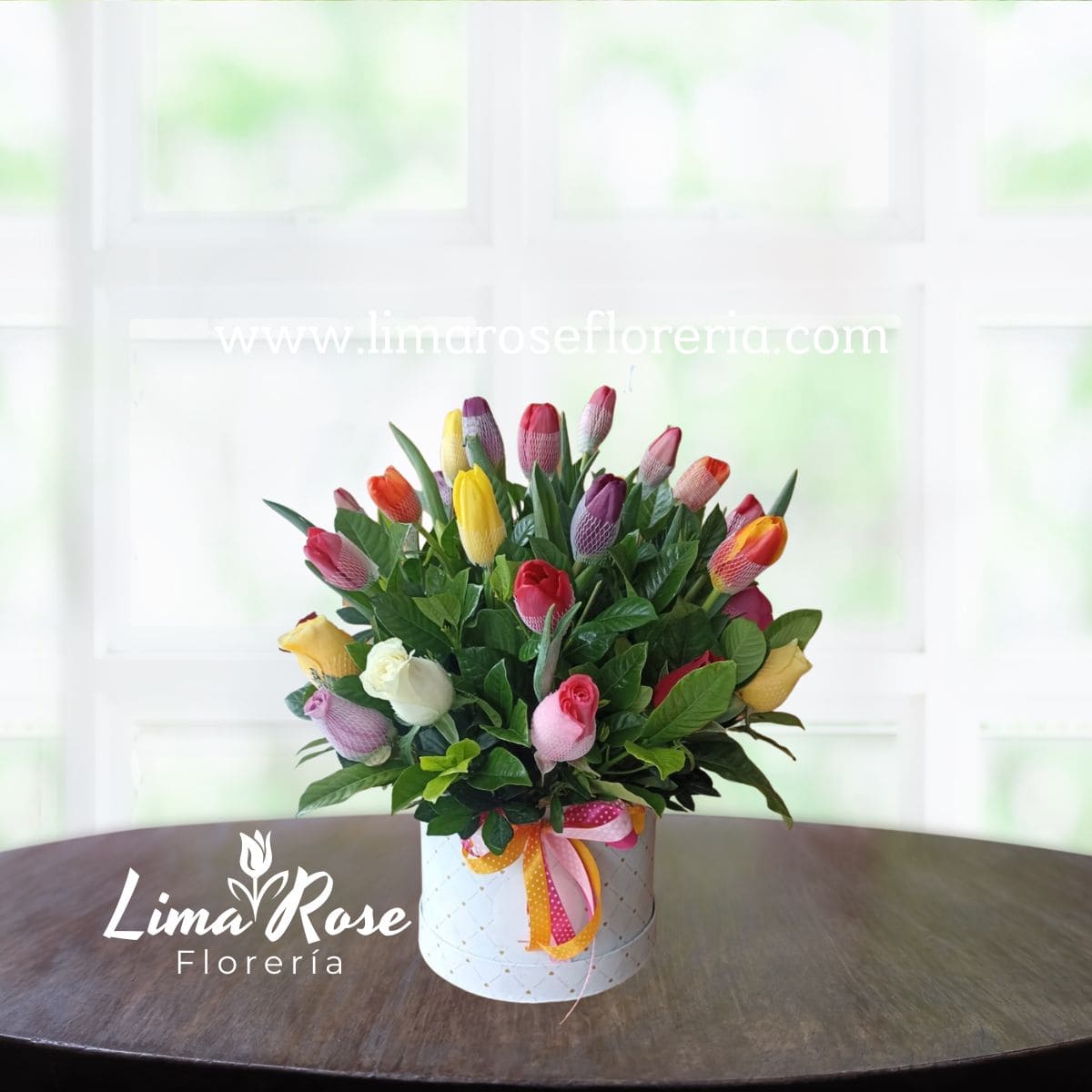 Exclusivo box premium compuesto por 15 tulipanes de colores, complementados con rosas en variados tonos y delicado follaje verde que realza la frescura y elegancia del diseño. Un arreglo sofisticado y armonioso, ideal para sorprender en aniversarios, cumpleaños o cualquier ocasión especial donde quieras expresar cariño y buen gusto.