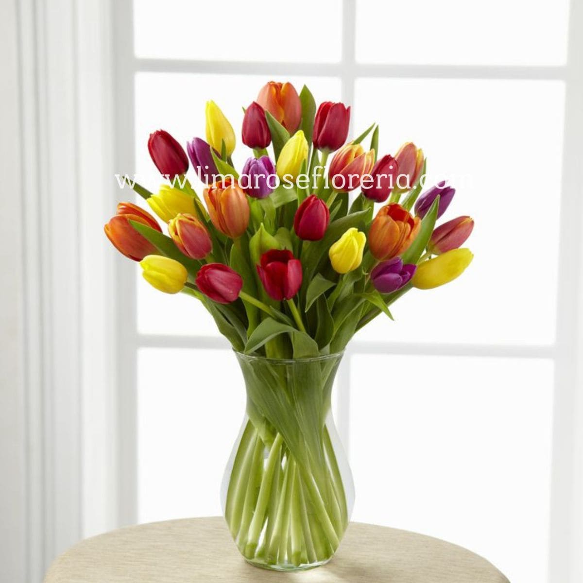 Elegante florero de cristal compuesto por 25 tulipanes frescos en variedad de colores, cuidadosamente seleccionados y acompañados de fino follaje verde que realza su frescura y belleza natural. Un arreglo sofisticado y armonioso, ideal para decorar espacios, sorprender en ocasiones especiales o expresar cariño con estilo y elegancia.
