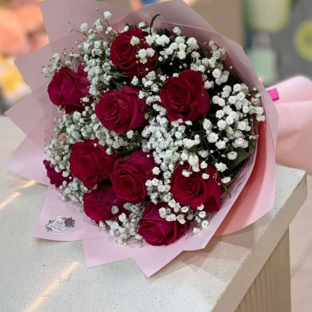 Delicado ramo de 10 rosas frescas, acompañado de lluvia de gipsofilia que aporta suavidad y elegancia al diseño. Ideal para expresar cariño, admiración o para cualquier ocasión especial donde se quiera sorprender con un detalle romántico y refinado.