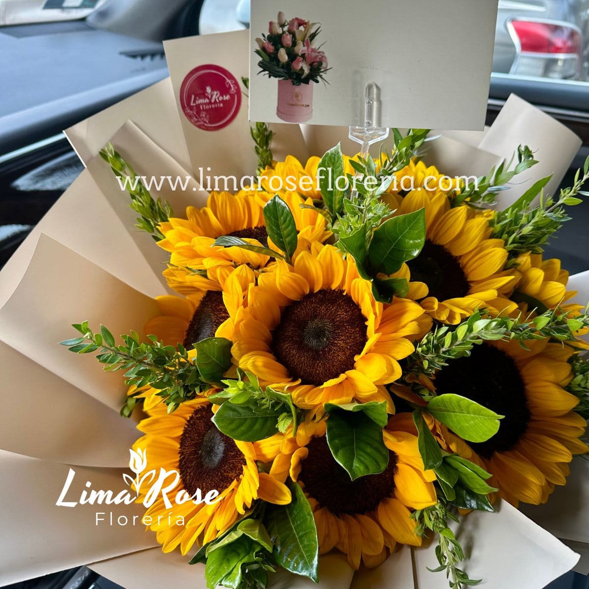 Delicado ramo de 10 girasoles frescos, acompañado de fino follaje verde que realza la frescura y el color del diseño, presentado en envoltura elegante que aporta un toque sofisticado. Ideal para expresar alegría, cariño o sorprender en cumpleaños, aniversarios o cualquier ocasión especial con un detalle vibrante y elegante.