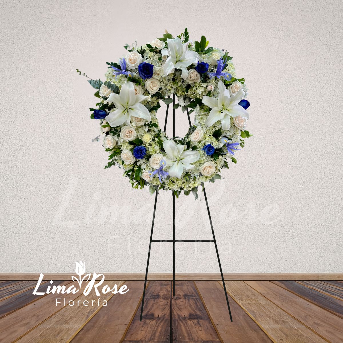 Distinguida corona en forma de dona, de aproximadamente 2 metros de altura, elaborada con una base estructural de delicadas flores blancas que aportan armonía y volumen al diseño. En la superficie destacan finas rosas blancas acompañadas de elegantes liliums blancos que brindan protagonismo y pureza. Sutiles toques de flores en tono azul aportan contraste y serenidad, creando una composición equilibrada y de gran presencia. Incluye tarjeta impresa para dedicatoria personalizada, permitiendo expresar un mensaje lleno de paz, respeto y homenaje eterno. Una pieza de estilo sobrio y refinado, ideal para despedidas solemnes y significativas.