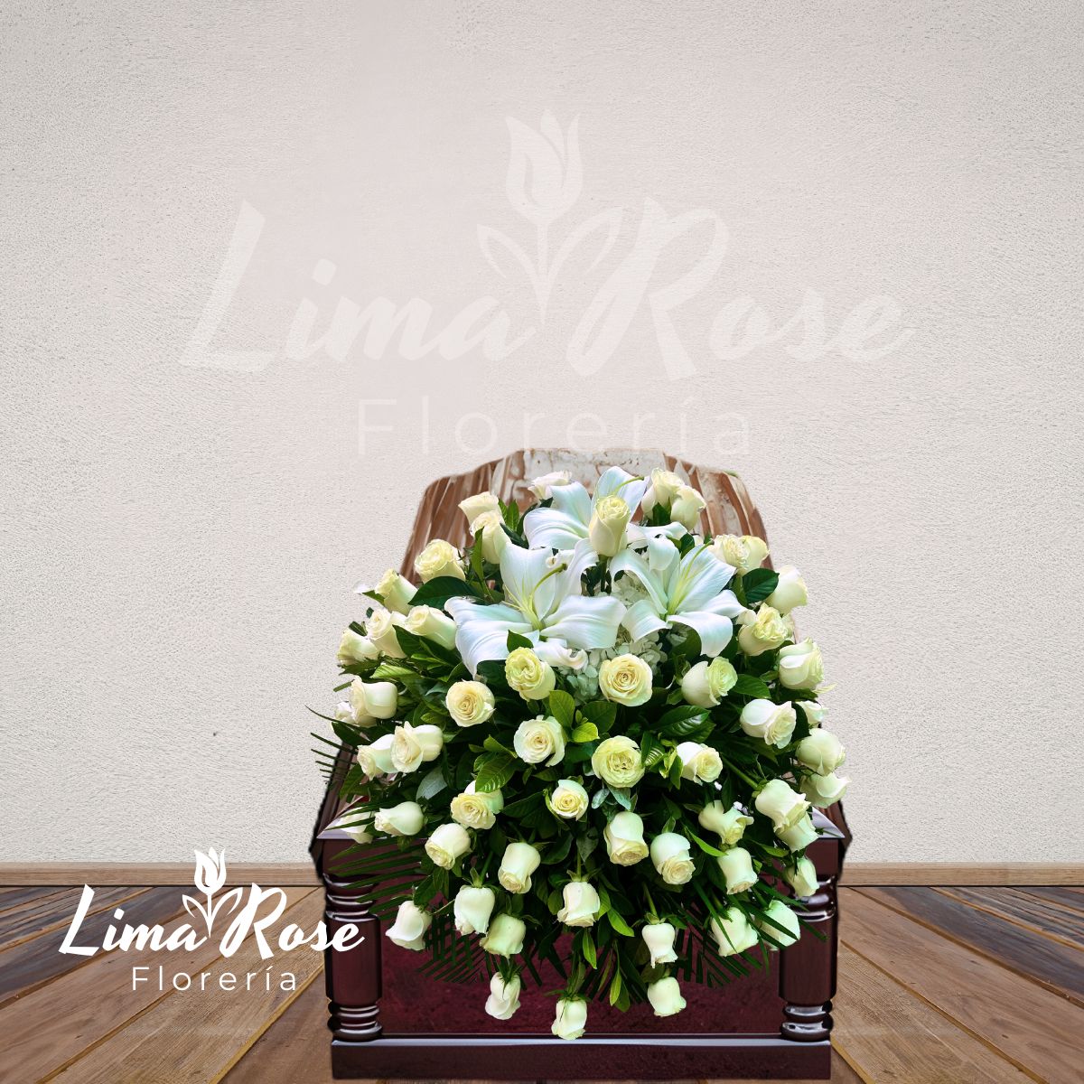 Solemne manto floral para ataúd, elaborado con una abundante composición de rosas blancas que simbolizan pureza, respeto y amor eterno. En la parte superior del diseño destacan elegantes liliums blancos que aportan protagonismo, distinción y un significado de luz y descanso eterno. El conjunto se complementa con fino follaje verde natural, creando armonía y realzando la belleza de cada flor. Una pieza de profunda sensibilidad y gran presencia, ideal para rendir un homenaje lleno de paz, honor y despedida sincera. Incluye tarjeta impresa para dedicatoria personalizada.