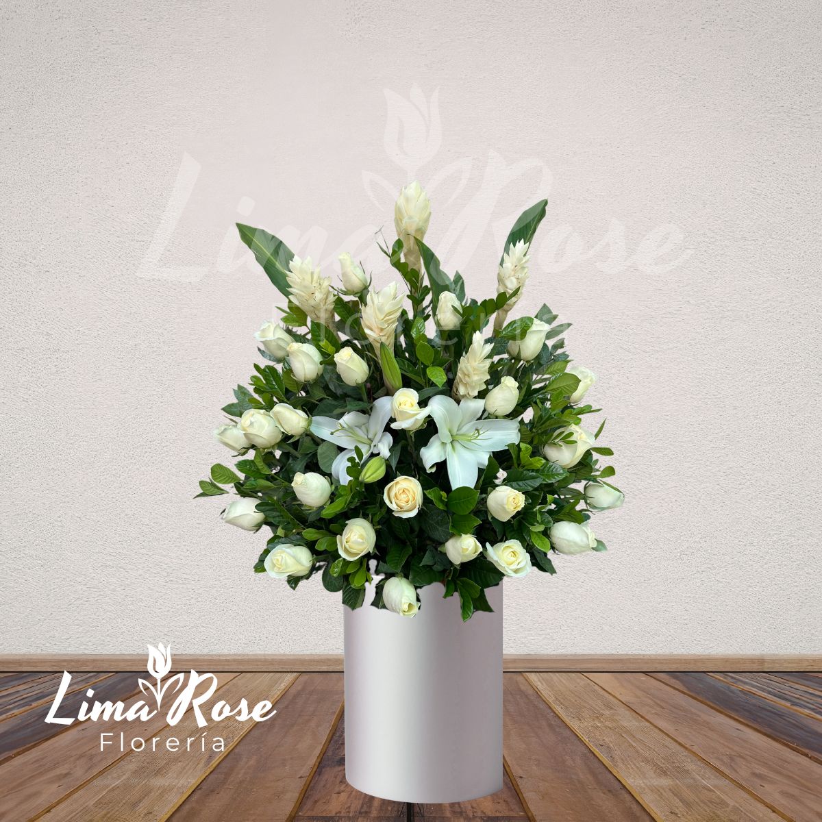 Elegante arreglo floral en forma de abanico, con medidas aproximadas de 60 x 70 cm, elaborado con delicadas rosas blancas y distinguidos liliums blancos que simbolizan paz, pureza y respeto eterno. El diseño se complementa con fino follaje verde natural que aporta estructura, frescura y equilibrio visual, realzando su forma abierta y estilizada y brindando mayor amplitud vertical al arreglo. Incluye tarjeta impresa para dedicatoria personalizada. Una pieza sobria y significativa, ideal para expresar un homenaje lleno de serenidad, luz y amor eterno.
