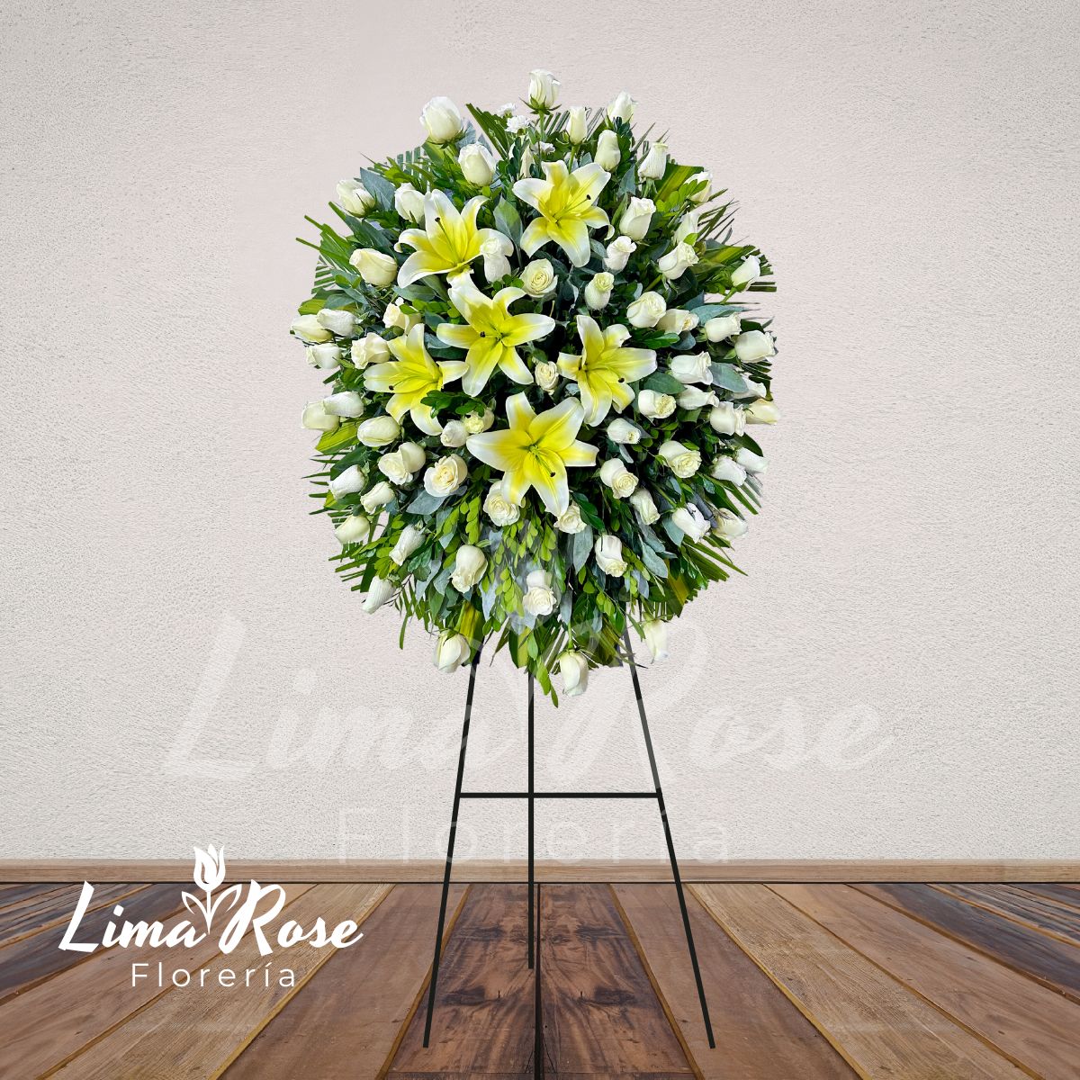 Majestuosa corona superior premium de aproximadamente 2.20 metros de altura, elaborada con abundantes rosas blancas que aportan volumen, elegancia y una presencia imponente. En el centro destacan varios liliums en tono blanco crema, que brindan distinción, profundidad y un acabado refinado al diseño. La composición se complementa con fino follaje verde natural, logrando equilibrio, frescura y armonía visual. Incluye tarjeta impresa para dedicatoria personalizada. Una pieza de categoría superior, ideal para rendir un homenaje solemne con máxima elegancia, respeto y amor eterno.