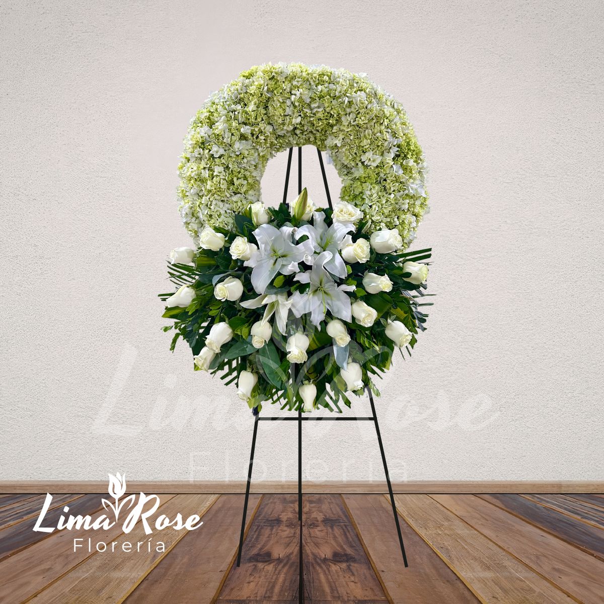 Distinguida corona floral blanca con diseño en semi círculo en la parte superior, elaborada cuidadosamente con delicadas flores blancas que simbolizan paz, luz y descanso eterno. En la parte inferior se integra una armoniosa composición floral de rosas blancas acompañadas de flores complementarias, destacando en el centro tres elegantes liliums blancos que aportan protagonismo y distinción. El diseño se complementa con fino follaje verde natural que brinda estructura y equilibrio visual. Incluye tarjeta impresa para dedicatoria personalizada. Una pieza solemne y refinada, ideal para expresar un homenaje lleno de respeto, serenidad y amor eterno.
