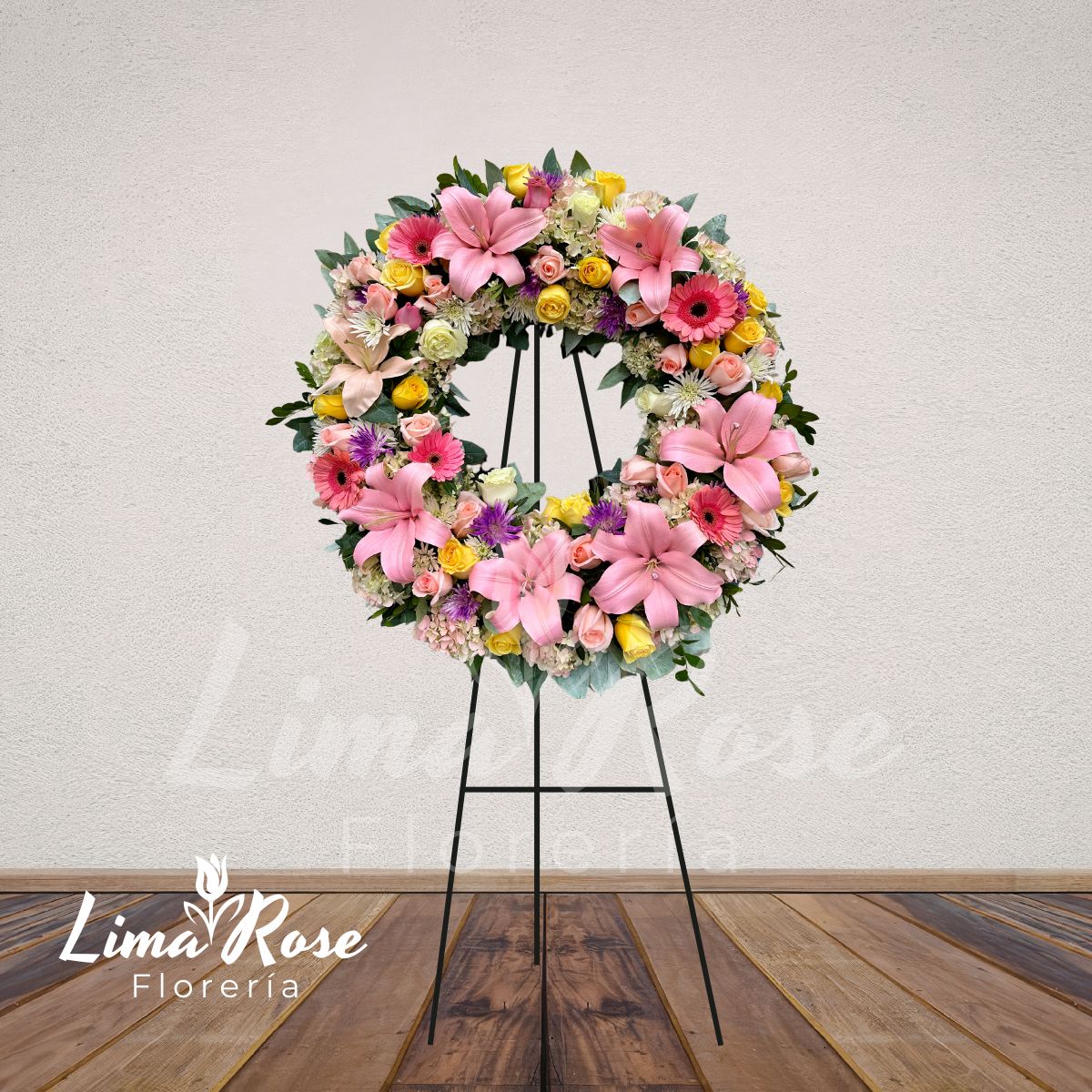 Hermosa corona floral tipo dona de aproximadamente 2 metros de altura, elaborada con una variada selección de flores en tonos primaverales que transmiten luz, esperanza y gratitud. La composición integra rosas blancas, amarillas y rosadas cuidadosamente distribuidas, creando un contraste armonioso y lleno de vida. En la superficie destacan gerberas y liliums rosados como flores protagonistas, aportando frescura, textura y un toque especial al diseño. El conjunto se complementa con fino follaje verde natural que realza la forma y el volumen de la corona. Incluye tarjeta impresa para dedicatoria personalizada. Una pieza vibrante y significativa, ideal para rendir un homenaje lleno de color, luz y un recuerdo que florece eternamente.
