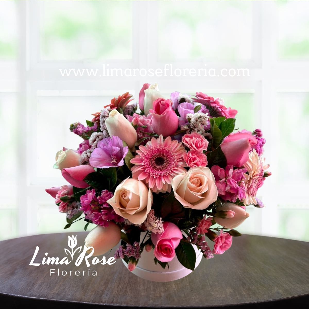 Exclusivo box circular premium conformado por una hermosa variedad de flores en tonos rosados, compuesto principalmente por rosas y gerberas en diferentes colores, complementadas con flores adicionales de la mejor calidad. Un arreglo sofisticado y armonioso, ideal para expresar cariño, admiración y elegancia en momentos especiales como aniversarios, cumpleaños o celebraciones únicas.